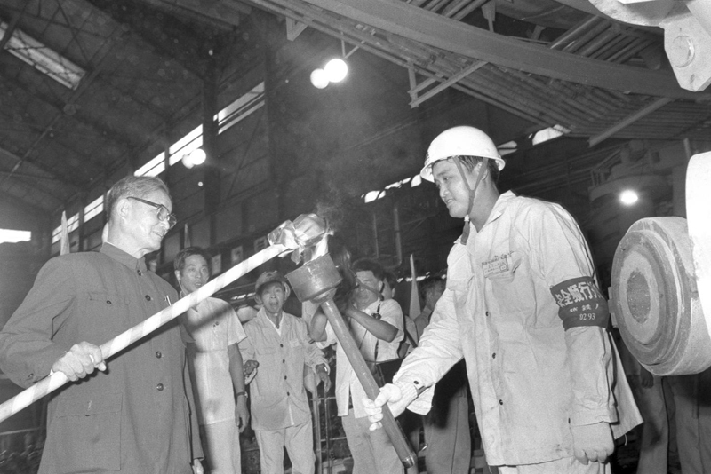 1985年9月15日,我国第一座日产万吨铁的高炉——宝钢一号高炉点火试生产。这是宋平同志(左一)为高炉点火。